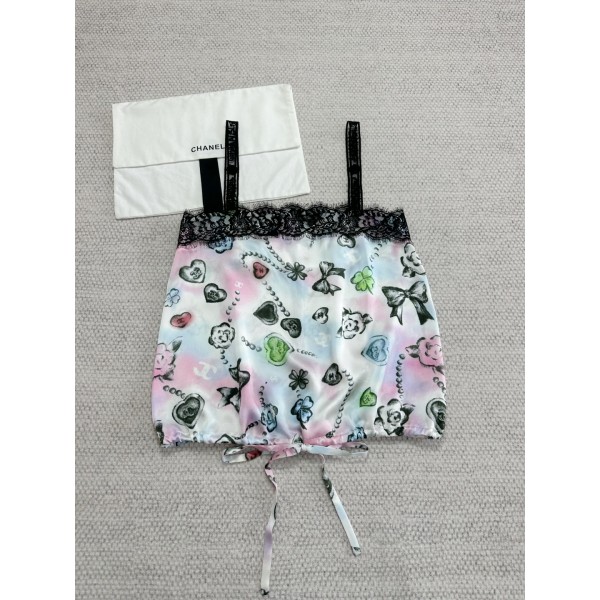 샤넬 25B 실크 프린트 조끼 ZP18700 값진 실크 나시, 맞춤 제작 실크 새틴 프린트 수입 속눈썹 레이스 가장자리 연결 어깨 레이스 자수 이니셜 + 동백꽃 로고 습기 흡수, 통기성, 피부 친화성, 너무 시원함
