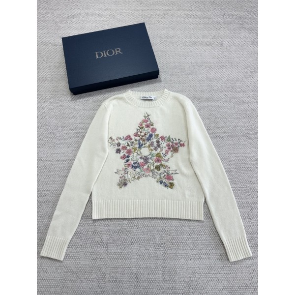 DIOR 별 캐시미어 스웨터, ZP24000 화이트 캐시미어 원단으로 정교하게 제작 다양한 컬러의 디올 스타 자수로 디올의 럭키스타를 표현하고 디올의 럭키 액세서리를 재해석하여 세련된 플로럴 모티브를 돋보이게 함 일반적인 핏과 골지 장식은 다양한 스타일에 격식을 높일 수 있으며 사계절 내내 적합함 캐시미어는 촉감이 부드럽고 섬세하여 착용감이 매우 편안함