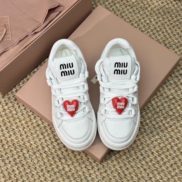 미우미우 25 시그니처 하트 로고 라운드 스니커즈 최고급 완산품 겉감 송아지 가죽 안감 징검다리 양가죽 원판 오픈 프레임 밑창 밑두께: 3cm
