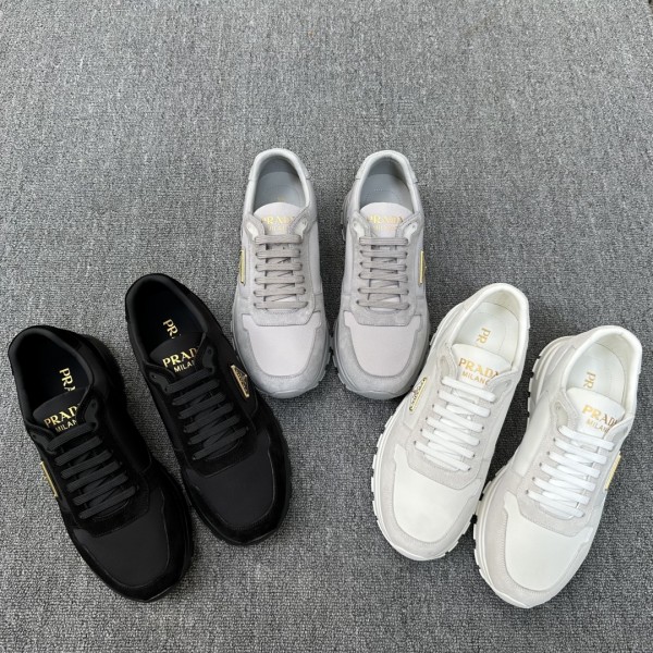 프라다 Prax 01 재생 나일론과 펄 소가죽 스니커즈 재생 나일론과 반짝이는 소가죽으로 제작 삼각형 로고가 새로운 스포티한 매력을 발산함 바닥에 에나멜 삼각형 로고 바르기 스니커즈에는 프라다 밀라노 실크스크린 프린트 로고 가벼운 밑창과 노치라인 45mm 밑창 탈부착식 깔창