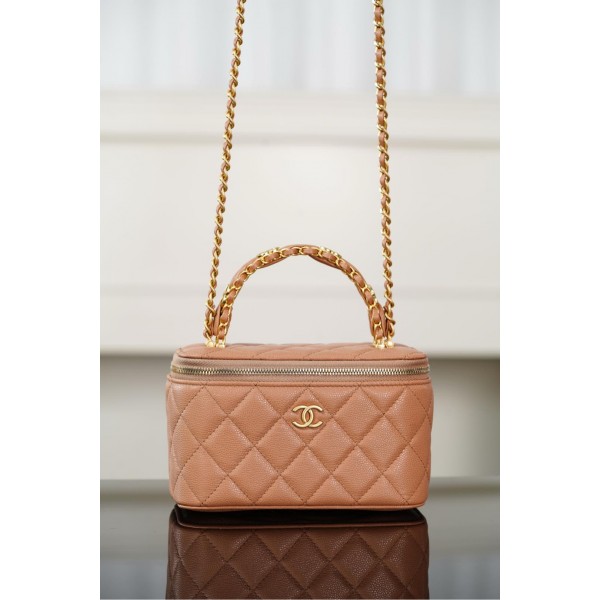 샤넬 25B 베니티 백 카멜 네모난 가방형 실루엣, 클래식한 마름모 무늬 매끄러운 모서리가 부드러움까지 정면에 더블 C 메탈 포인트, 밑면에 입체적인 더블 C 엠보 손잡이에 몇 개의 작은 더블 C와 가죽을 믹스매치하여 포인트 용량과 공간이 커서 아름답고 실용적인 제품 사이즈: 19.5x12x6.5cm
