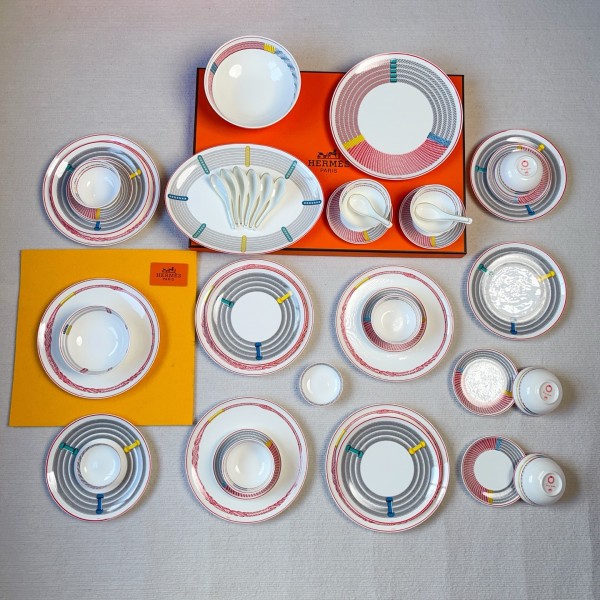 에르메스 Tressages Equestres 42pcs 그릇 시리즈 마구를 만들 때 사용하는 테두리와 테두리에서 영감을 얻었음 에르메스 도자기 부문 크리에이티브 디렉터 Benoit Pierre Emery가 디자인하였음 전 라인에 걸쳐 촘촘하고 정교한 라인이 조화를 이루어 결감을 더욱 입체적이고 풍부하며 산뜻하게 만들어주는 레몬 옐로우와 민트 그린에 다크 블루 그린과 파이버 가죽과 내추럴 컬러 대비 보기 좋아요 각기 다른 모양의 식기류가 돋보이는 균형미학