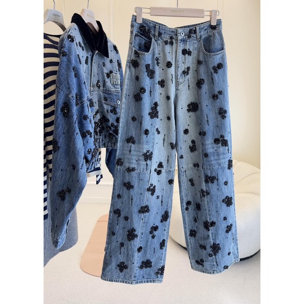미우미우 업사이클드 비즈 청바지 연청 데님+블랙 플라워 자수로 볼륨감 넘치고 예술적인 느낌 하이웨스트 와이드 디자인으로 날씬해 보이고 짧은 코트나 화이트 T와 매치해 손쉽게 고급스러움을 연출가능 데일리 외출, 데이트 모두 스타일리시한 분위기로 연출할 수 있는 리미티드 라인
