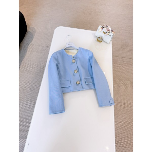 VALENTINO 25S 큐빅 조각 금단추 미세먼지 블루 숏 재킷 스모그 블루 쇼트 코트 정염 원단의 질감이 섬세하고 골드 조각 단추 + 자카드 안감으로 절제되면서도 세련되고 짧은 컷팅으로 하이웨스트 스커트나 팬츠를 매치하여 우아하고 빈티지한 로맨틱 스타일을 연출