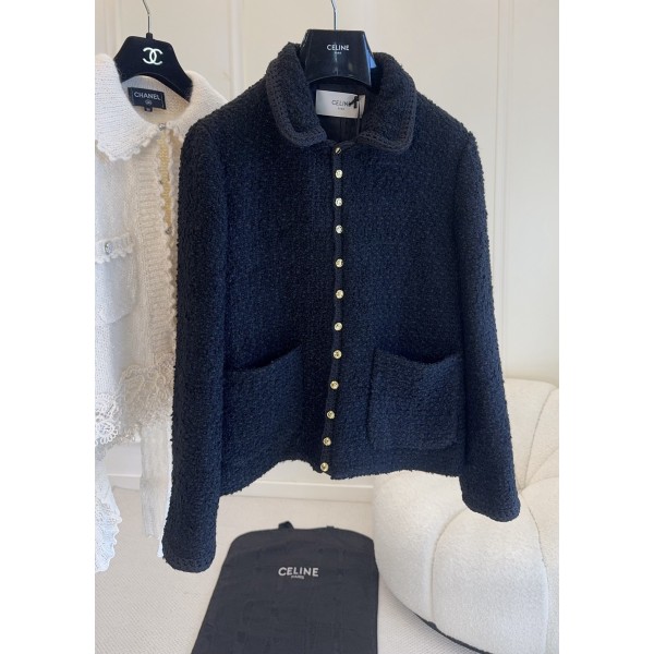 셀린느 2025 가을/겨울 신상 아우터 수지와 함께 울혼방 도톰한 블랙톤 트위드 텍스처 메탈릭 골드 버튼이 몸매를 따라 배치 셀린느 스타일의 미니멀하고 럭셔리함을 한올 한올 반영 정장바지에 세련된 아이템, 데일리로 청바지와 입는 캐주얼
