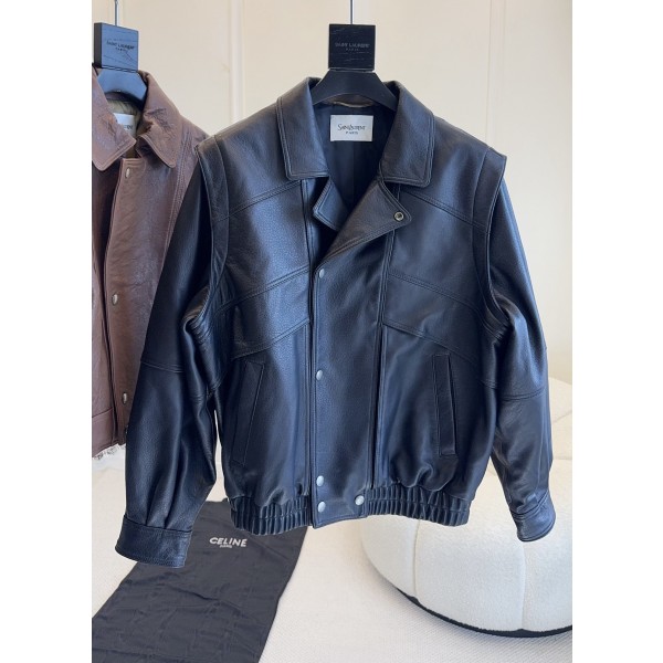 YSL 생로랑 2025 F/W 신상 블랙 레더 코트 수입된 고급 양가죽으로 부드럽고 광택이 있으며 질감 만점 클래식한 모터사이클 스타일 + 터틀넥 디자인 칼라 투웨이, 커스텀 로고 메탈 버튼, 짧은 컷팅 하이웨스트 팬츠나 스커트 모두 멋스러우며 가을과 겨울에 스타일리시하게 입으실 수 있음 통근, 캐주얼, 길거리에서도 부담없이 소화하실 수 있음