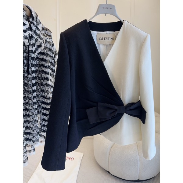 발렌티노 2025 F/W 신상 배색 리본 정장 코트 블랙+베이지 컬러의 디자인, 빅 리본 맞춤 울 소재, 브랜드 플로럴 쟈가드 안감 부드럽고 힘있는 컷팅, 깔끔한 터틀넥 레이스 셔츠나 청바지에 모두 잘 어울리며 통근, 가벼운 공식석상에서도 쉽게 소화 가능한 우아하고 시크한 발렌티노의 시그니처 디자인 중 하나