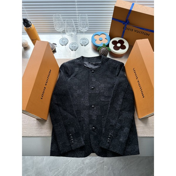 Louis Vuitton 25 FW 피케 데님 노카라 점퍼 ZP 29100 구매 분해 제작 맞춤 코튼 혼방 피케 데님 소재, 오픈 여밈 LV 레터링 펄 버튼 앞판 스티커 디자인, 레터링 스터드 장착 소매 오픈 여밈 LV 레터링 펄 버튼 뒷판 장식 LV 레터링 비즈로 1:1 copy