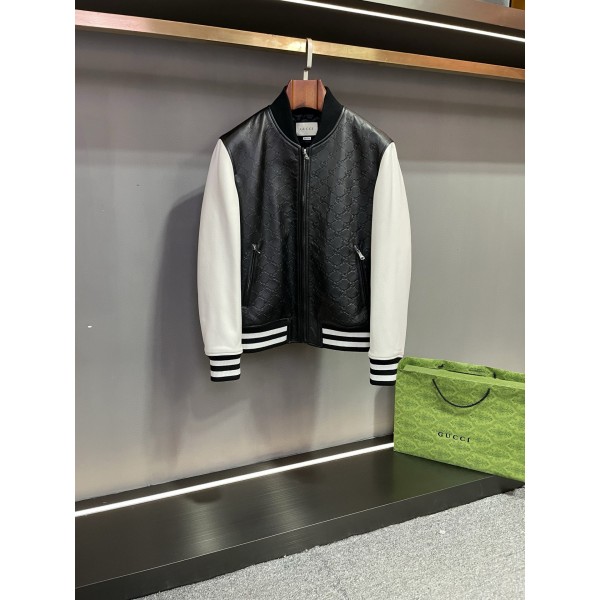 GUCCI 2025 가을/겨울 신상 남성 양가죽 재킷 정교한 공예, 럭셔리 품질 호주산 수입 양가죽으로 정성스럽게 제작 모든 디테일이 브랜드의 뛰어난 추구를 보여줌 바디 부분은 블랙 양가죽, 구찌 시그니처 로고 더블 G 엠보 소매는 화이트 양가죽에 독특한 컬러풀한 디자인으로 패셔너블한 활력을 더했음
