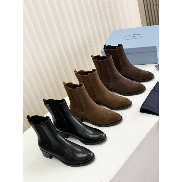 프라다 완산품 최고급, 공식 홈페이지 동시판매 2025 가을겨울 신상 첼시 앵클부츠 겉감 수입 송아지 가죽/고광택 소가죽 안감 깔개 혼종 양가죽, 부드럽고 섬세하며 편안하고 통기성이 좋으며 이태리 리얼 가죽 사출 바닥 굽 4cm, 통 높이 14cm
