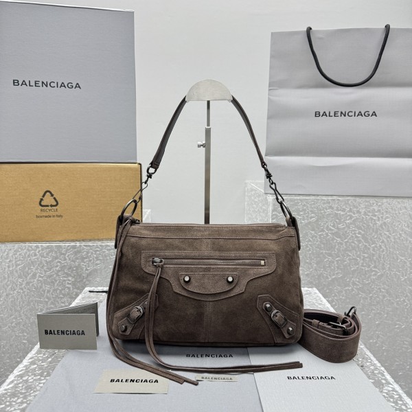 발렌시아가 르 씨티 모터백 스몰 클래식한 류딩과 프린지, 위트있는 스크럽 새로운 가방 모양, 전체적인 스타일링에 포인트를 줌 탈부착이 가능한 긴 숄더 스트랩과 크로스도 세련되게 연출가능 사이즈: 29x19x12cm