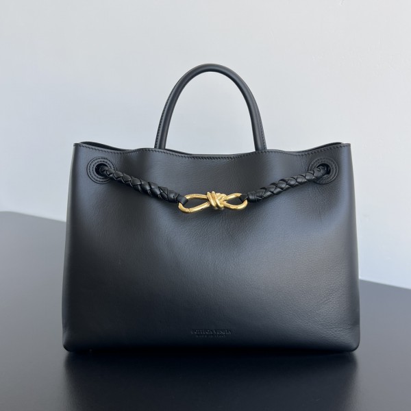 BV 올 겨울 색다른 느낌의 Andiamo 미디엄 탑핸들백 모델번호 810214 광택감 있는 전피와 짜임 스트랩이 절묘하게 조화를 이루며 knot 금속 끈 하나로 스트랩에 포인트 장식 가죽은 엄선된 네덜란드 송아지 가죽으로 아기 피부처럼 부드러운 촉감 사이즈: 32x24x12cm