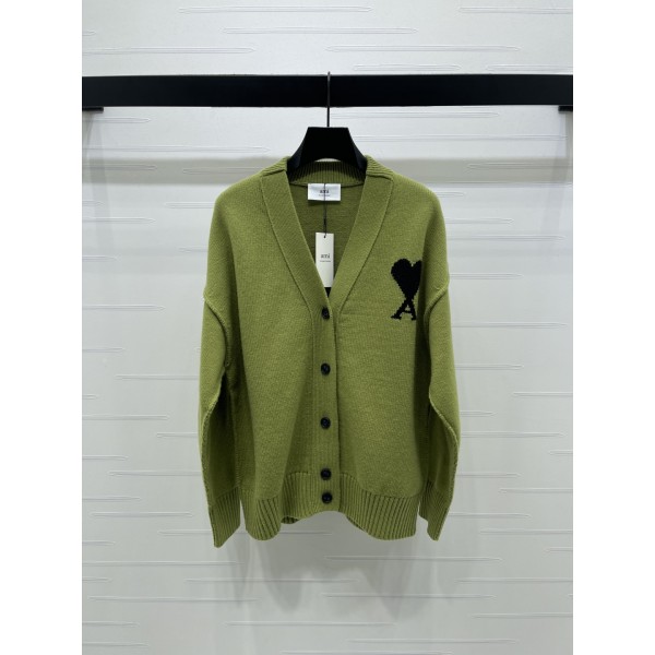 Ami 2025 가을/겨울 최신 시리즈 하트 크로커 브이넥 니트 긴팔 카디건 맞춤형 울 혼방 실 소재 직조 밀도 높은 니트로 또렷한 모발 피부결을 만들어주고 가슴에 사랑의 A 패턴 장식 풍부한 디자인 레이어드핏의 바디킷을 감싸주는 스타일리쉬함