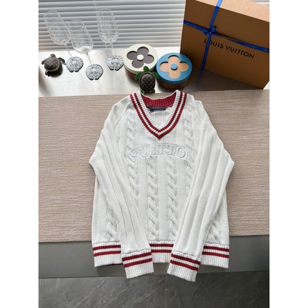 Louis Vuitton 25F 자수 로고 스쿨룩 브이넥 니트 풀오버 ZP 16000 구매 분해 제작 커스텀 화이트 코튼 울 혼방 소재 넥 소매 밑단 그라데이션 스트라이프 디자인 앞판 장식 LV 자수 로고 패치, 로고 골지 넥 소매 밑단 고정 초밀도로 부분 짜임, 진정한 1:1 재현