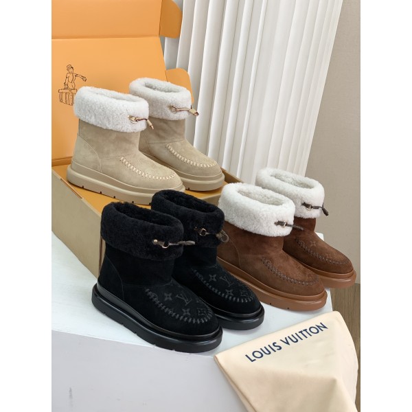 LV 루이비통 채널 주문, 공식 홈페이지 동시 2025 가을/겨울 최신형 빈티지 통굽 스웨이드 스노우 부츠 겉감 수입 고광택 소 반폴라로 빈티지한 느낌이 물씬 풍기며 안감에는 최고급 램스울이 깔려서 부드럽고 섬세하며 편안하고 보온성이 좋으며 고무 몰드 충격 흡수 밑창으로 가볍고 탄력이 높으며 굽은 4cm, 통높이는 16cm