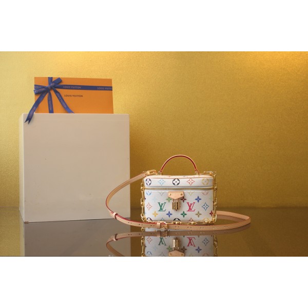 루이비통 X TM 베니티 체인 파우치 모델번호 M13662 무라카미 타카시 Vanity Pouch 모노그램 멀티컬러 코팅 캔버스에 소가죽으로 제작 디테일로 충분한 품질 설명 가능 핏, 가죽 보기, 라인 보기, 오일 가장자리 보기 핸들 곡선을 보기, 마지막으로 메탈의 밝기 사이즈 19X11.5cm