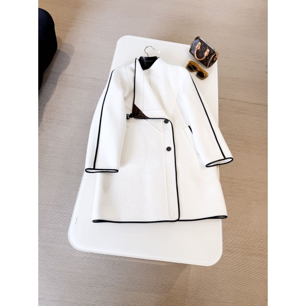 LV FW26S 화이트 알파카 패치 사이드 버튼 코트 부드럽고 볼륨감 있는 울 소재 YB일치 무게 블랙 베젤 모노그램 로고 루즈핏 사이드 버클 디자인 세련되고 고급스러우며 통근 캐주얼에도 무난하게 소화 가능