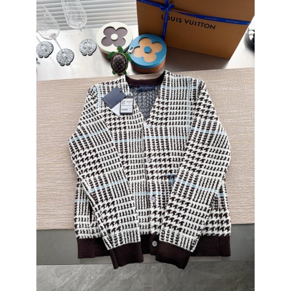 루이비통 25FW 레터링 로고 체크 니트 가디건 ZP 15100 구매 해체 제작 맞춤 코튼 울혼방 소재로 이태리제 전폭 장식 LV 글렌 플라이드 자카드 여밈 맞춤 LV 레터링 로고 펄단추에 철물받침 양쪽에 플러그 포켓, LV 레터링 로고 자카드 정직 시그니처 시보리 소매 밑단, 초밀도로 부분짜임 진짜1:1 복원