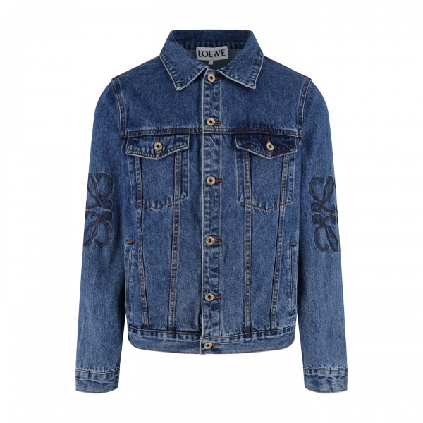 로에베 자수 워싱 구제 데님 점퍼 원단은 12온스 7*7 트윌 데님 원단을 사용하고 자수는 3D 입체 자수를 사용하며 양면 자수 바늘 수는 약 12,000바늘 모래 세탁과 색상 구제 등 일련의 공정 버튼 전기도금 빈티지 옐로우 버튼 부재료 5포대에는 전기도금 구제 황동색 모자못이 있음 뒷부분 가죽 로고 엠보 가죽 가죽 로고 팔꿈치 부분에 Anagram 자수가 장식 루즈한 핏으로 낮은 뒷면 포켓 뒷면에 로에베 엠보 가죽 패치