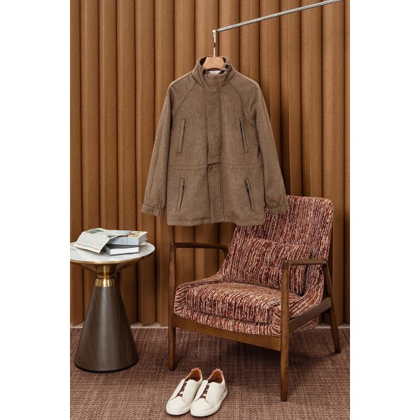 LP 최고 클래식 트래블러 울 캐시미어 코트 정교한 디자인의 입체 이중 칼라 양가죽으로 스타일링 감각과 독특함을 모두 갖춘 독특한 선구자 네 개의 포켓 모두 지퍼 디테일이 돋보이는 디자인으로 남성의 우아함과 젠틀함을 표현하였음 입체적인 커팅 기법을 사용하여 선이 단단하고 긴장감이 넘치며 깊게 파인 네크라인은 목선을 잘 잡아줄 뿐만 아니라 시각적으로 얼굴의 비율을 늘려주어 이목구비를 더욱 입체적으로 만들어 줌 핏은 슬림한 로프로 정교하게 디자인되어 바디라인을 완벽하게 그려주어 남성적인 건강함을 보여주면서도 지나치게 타이트하지 않고 활동 공간을 충분히 확보하여 편안한 활동 공간을 제공함 최고급 울 캐시미어 혼방 소재를 사용하여 천연 섬유와 하이테크 합성 섬유를 완벽하게 결합하였음 안감은 부드럽고 편안한 폴리에스테르 소재를 사용하여 촉감이 섬세하고 촉촉하여 몸에 잘 밀착되어 답답함과 불편함을 피할 수 있음