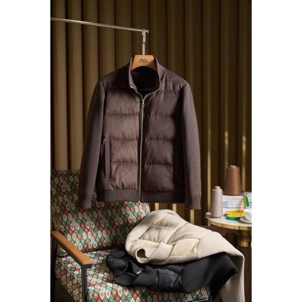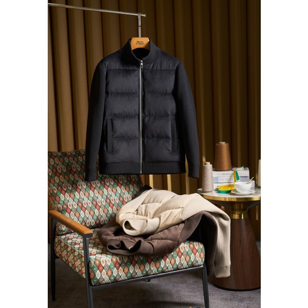 로로피아나 니트 모직 플러스 다운 90 화이트 오리털 경량 보온 패션 자켓 차이나 니트 패딩 니트+모직+다운 세 가지 럭셔리 소재로 겨울 패션 미학을 재구성 고지원 정방 니트 원단을 선택하여 섬세한 모직의 결을 맞추면 촉감이 구름처럼 부드럽고 찰랑찰랑하며 핏이 어깨와 목선에 깔끔하게 밀착되어 남성의 날씬한 체형을 그려냄 내부에는 90%의 흰 오리털이 채워져 있으며 여러 번의 청소와 볼륨 테스트를 통해 경량에도 부담감이 없고 온도 유지 성능이 일반적인 다운 제품보다 훨씬 뛰어나 겨울 보온과 거동이 자유로움