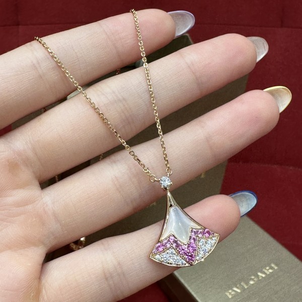 불가리 Divas Dream 컬렉션 2025년 칠석 한정 목걸이 샤이니 핑크 블루 다이아몬드 목걸이 은은하고 우아한 디자인으로 아이코닉한 부채꼴 패턴을 표현 진주 샤이니와 핑크 사파이어가 어우러져 아름다운 광채를 선사함