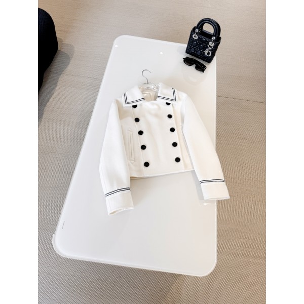 DIOR 26S 블랙화이트 더블 울 칼라 정장자켓 혼방 소재로 부드럽고 따뜻하며 클래식한 더블 장식 CD 블랙 버튼에 블랙과 화이트 컬러의 스트라이프 포인트 칼라가 심플하고 우아한 짧은 컷팅으로 세련되고 스타일리쉬한 느낌을 줌