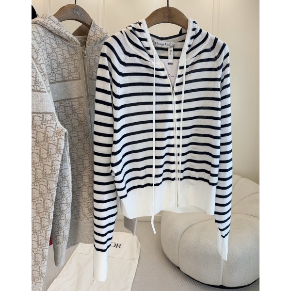 Dior 2026 초봄 신상 마린 스트라이프 캐시미어 실크 후드 집업 영원의 클래식 마린 스트라이프 카디건 실크+캐시미어 소재 너무 편해요 캐주얼 feel 후드 집업 가디건 핏 짧은 기장감에 라비례, 소매와 밑단 잔주름으로 장식 등판 장식 8번과 로고 프린팅이 심플하면서도 스타일리쉬함