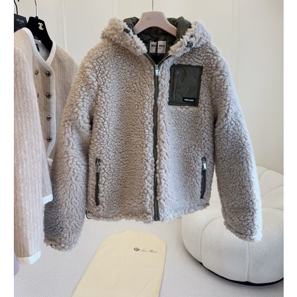 미우미우 2025 가을과 겨울의 새로운 푸들 양털 후드 패딩 점퍼 겉감에는 62%의 면모 + 38%의 재생 폴리에스터 섬유로 부드럽고 섬세하며 안감에는 흰 구스다운이 채워져 있어 보온력 만점 카키색 푸들 양털은 밀리터리 그린 나일론으로 완성되어 있으며 밑단에는 스트링 끈이 있고 가슴에는 밀리터리 지퍼 스티커가 있어 디테일이 가득함