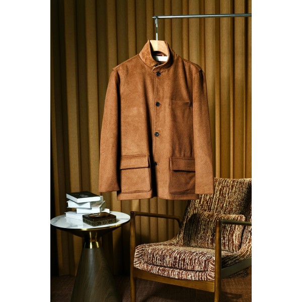 LP 프리미엄 캐시미어 혼방 앰버 브라운 남성용 재킷 황금 콤비 원단의 터치감과 성능의 완벽한 밸런스를 자랑함 캐시미어 20%와 울 80%를 엄선하여 정성껏 제작 양가죽 플랩 포켓은 캐시미어의 섬세한 스킨십을 유지하고 양모의 보온성과 강인함을 겸비하여 추운 계절에 따뜻한 방어선을 구축하면서도 항상 우아한 실루엣을 유지하게 함 일상적인 외출이든 비즈니스든 사람들 사이에서 두각을 나타냄