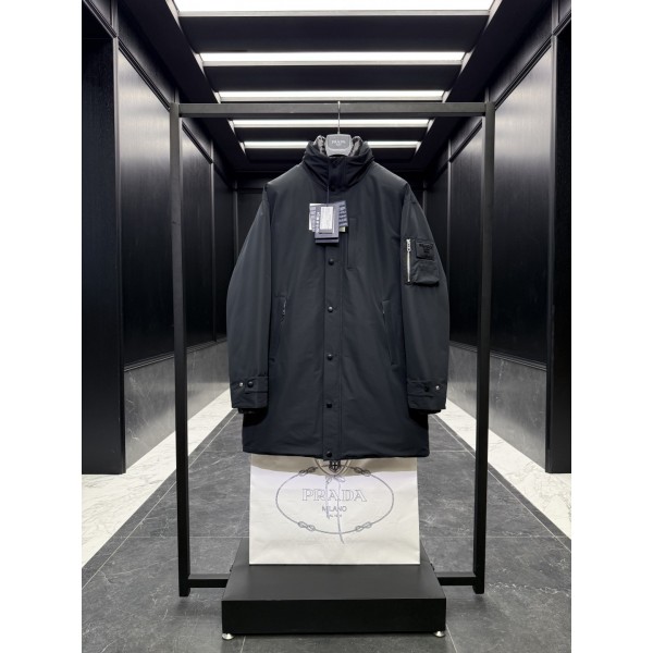 프라다 하프기장 후드 패딩 점퍼 삼방 기술의 원단 구입 개발, 구스다운 완전 빵빵하게 충전 시중에 나와 있는 쭈글쭈글한 오리털 버전 비교 환영 일반 핏, 스탠드 칼라, 일자 슬리브 지퍼와 스냅 여밈, 지퍼 몰딩백 스판 커프스 비죠 스트랩과 똑딱이 아크 등판 밑단, 조절 스트랩 구스다운 라이닝과 패딩, 로크온 조인트 소매 레터링 로고