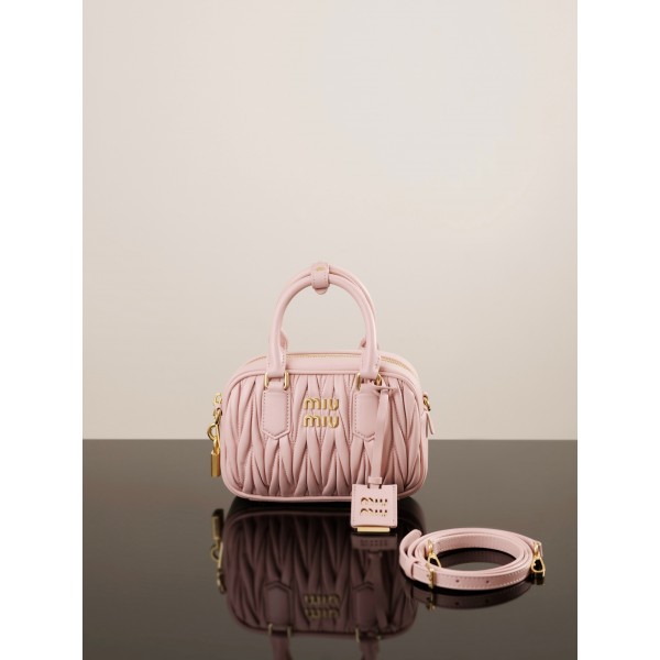 미우미우 아르카디 마테라세 탑핸들 토트백 양가죽 스노우핑크 마텔라세 패턴, 가죽 손잡이 탈부착식 조절식 105센티미터 길이의 가죽 스트랩 금색 철물 액세서리, 전면 코팅 메탈릭 로고 지퍼 여밈, 안감 패킹 2개 포함, 못 부착 Size:19*13*6cm 모델번호: 5BB123