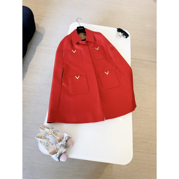 발렌티노 26S 레드 울 입체 금버튼 케이프코트 트윌 울 도톰한 소재로 따뜻하고 편안하며 레드 컬러가 돋보이는 네 개의 포켓 포인트 클래식 V 로고 케이프 핏으로 우아한 데일리 나들이 룩이 돋보임