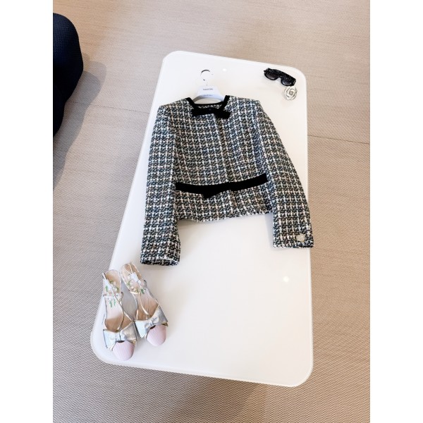 발렌티노 26S 트위드 벨벳 리본 숏 재킷 컬러 매쉬 트위드 소재의 빈티지한 고급스러움 블랙 벨벳 리본+허리라인으로 우아하면서도 몸매 비율이 드러나는 짧은 허리라인 핏에 하이웨스트 팬츠나 스커트를 매치하여 프렌치한 스타일링 부담없이 연출