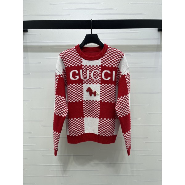 구찌 2026 이른 봄 최신 바둑판 체크 조랑말 니트 스웨터 새해맞이 시리즈 맞춤 양모사 직조, 섬세한 질감 편안한 착용감, 라운드넥 풀오버 스웨터 컷팅 목선 소매 호응 밑단 순홍색 나사산 보온 바디 중앙 입체 자수 조랑말의 생생한 생동감 부드럽고 찰랑찰랑한 울 원단, 루즈핏의 나른함