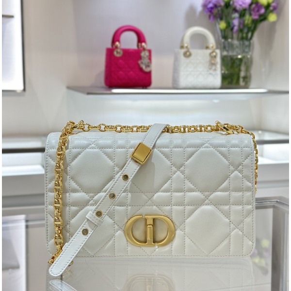 디올 카로백 미디엄 2025년 가을 기성복 시리즈 신상품 부드러운 실루엣에 패션 기질과 우아한 매력을 융합했음 럭셔리한 화이트 양가죽으로 정교하게 제작 오버사이즈 넝쿨무늬 박음질 라인 플랩 장식의 골드 메탈 노브형 CD 버클 미디엄 사이즈에 탈부착 가능한 CD 키링 스트랩 사이즈 : 25×16×9cm