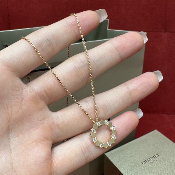 Chaumet 육각형 벌집 목걸이 벌집의 육각형에서 영감을 받아 사랑과 화합을 상징 심플함 속에 내색 없는 세련됨이 숨겨져 있음 엄선된 스와로브스키 스톤이 세팅되어 미러링 시 더욱 반짝반짝, 한 면 한 면 눈부시게 빛남