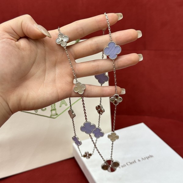 VCA 탈부착 가능 15가지 목걸이 맥문 자옥수/백패모/은레이 삼원소 혼합 탈부착 가능 15가지 목걸이 11가지 목걸이 + 4가지 꽃 팔찌로 탈부착 가능 여기에 크고 작은 네잎클로버를 믹스매치하여 참신하고 유니크한 디자인 파스텔 톤, 단품으로 착용해도 탈부착해도 돋보임