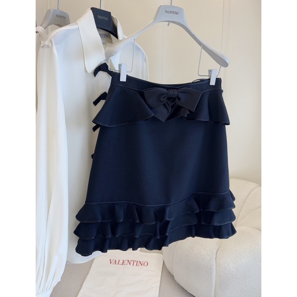 Valentino2026 이른 봄 새로운 블랙 리본 울 스커트 맞춤형 울 소재, 하이웨스트 디자인, 리본 장식 우아하면서도 레이어드한 느낌 스커트 자락에 프릴을 덧대어 날렵하고 찰랑찰랑한 느낌 데일리나 포멀한 자리에도 잘 어울리며 셔츠, 니트에도 잘 어울리며 가볍고 부드러운 고급스러움