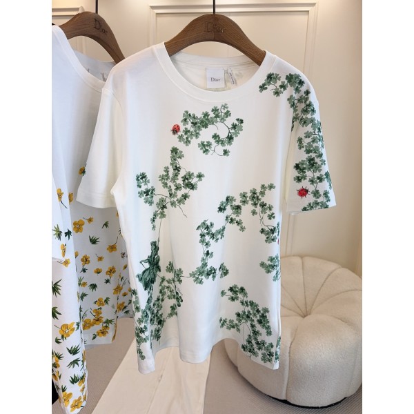 Dior 2026 이른 봄 신상 네잎 클로버 프린트 반팔 티셔츠 부드러운 면 소재, 편안하고 통기성 있는 착용감 그린 클로버 + 레드 무당벌레 프린트로 상큼하고 내추럴한 봄여름 분위기 물씬 데님 팬츠나 스커트와 매치하여 스타일리쉬하게 연출가능한 봄여름 코디 포인트 아이템