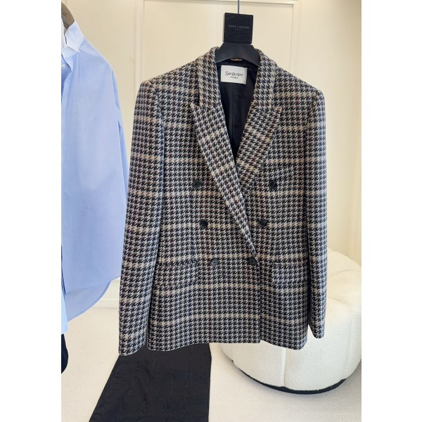 ysl 2026 초봄의 새로운 하운드투스 체크 더블 정장 코트 털을 깎은 울 소재, 부드럽고 따뜻한 소재 다양한 색상의 하운드투스 체크 복고풍과 우아함, 스티치 칼라+더블 버튼 깔끔한 실루엣, 아우라 풀오픈 적당한 기장감으로 통근이나 공식석상에도 부담없이 소화가능 파리한 무드로 스타일리쉬하면서도 실용적