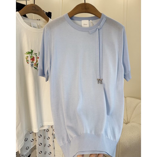 Dior 2026 봄여름 신상 리본 실크 니트 반팔 섬세한 실크 니트, 부드러운 스킨십 몸에 착 감기는 편안함, 슬림핏으로 바디라인을 그려주고 넥라인 스트링 리본 디자인으로 심플하면서도 고급스러운 은은한 하늘색, 상큼하고 부드러운 봄여름 필수 아이템 단품으로 입어도 이너로도 잘 어울림