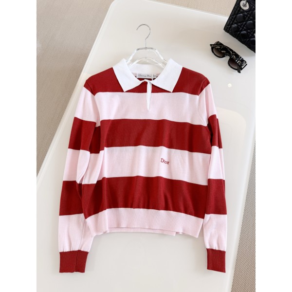 DIOR 26S 레드화이트 스트라이프 니트 자수 터틀넥 폴로 티셔츠 레드-화이트 컬러의 와이드 스트라이프 디자인에 화이트 터틀넥과 차이나카라 디테일의 가슴 자수 CD 로고 전체적으로 컷팅된 스쿨룩과 고급스러운 질감의 조화