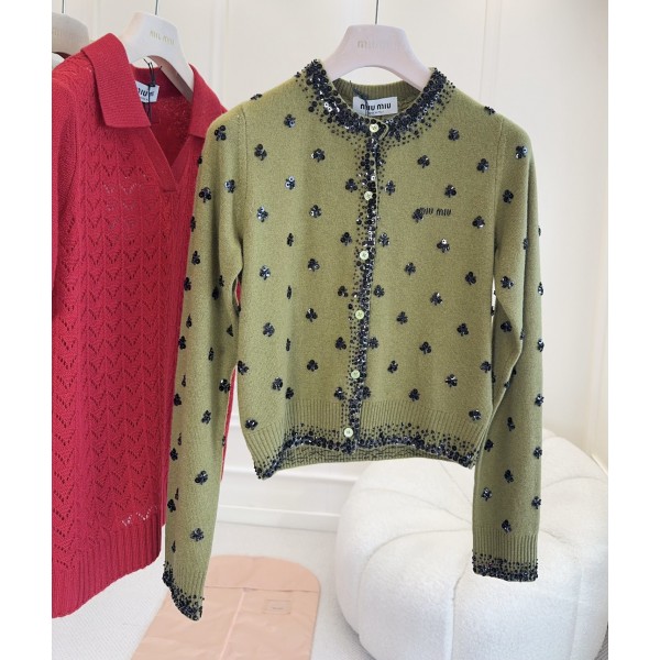 MiuMiu 2026 초봄 신상 비즈 니트 가디건 캐시미어 울 혼방, 블랙 비즈 포인트 네크라인과 집업 다이아몬드 체인 디자인이 매우 정교함 올리브 그린 앤티크 화이트 짧은 핏으로 단품으로 입거나 레이어드해도 돋보이며 일상적인 외출이나 모임에도 부담없이 소화 가능