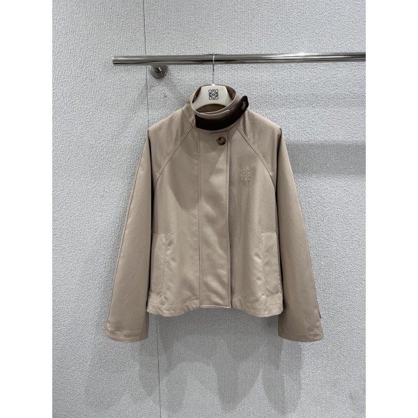 로에베 26 초봄 신상 로고 자수 숏 트렌치코트 단독 yb개발, 최상급 프리미엄 버전 제작 연한 카키 컬러의 고밀도 면 원단으로 힘 있는 질감과 부드럽게 떨어지는 느낌을 겸비 차이나 칼라에 다크 브라운 가죽 디테일로 빈티지한 원형 단추로 포인트를 주어 장인정신과 조화를 이룸 몸판 왼쪽에 Anagram 로고가 낮게 엠보싱되어 있으며 등판의 케이프 구조와 어깨 소매가 박시한 실루엣으로 레이어드한 아름다움을 선사함 골지 소매와 히든 지퍼 디자인으로 방풍 실용성과 미니멀리즘 미학을 겸비하여 봄날 출퇴근과 시티워크에 매우 적합한 아이템