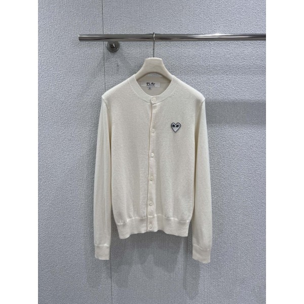 PLAY 꼼데가르송 26Ss 이른 봄 마이크로 로고 울 니트 가디건 순수한 베이지 컬러의 울 니트 베이스에 포인트를 주어 아이코닉한 미니멀리즘 스타일을 이어감 섬세한 울 혼방 원단을 엄선하여 부드럽고 피부에 친화적이며 보온성과 통기성을 겸비했음 라운드 네크라인과 싱글 버튼 디자인이 심플하고 깔끔하며 여유로운 실루엣으로 다양한 몸매에 매우 포용적 통근과 캐주얼 모두 스타일에 아이코닉한 재미를 더할 수 있음