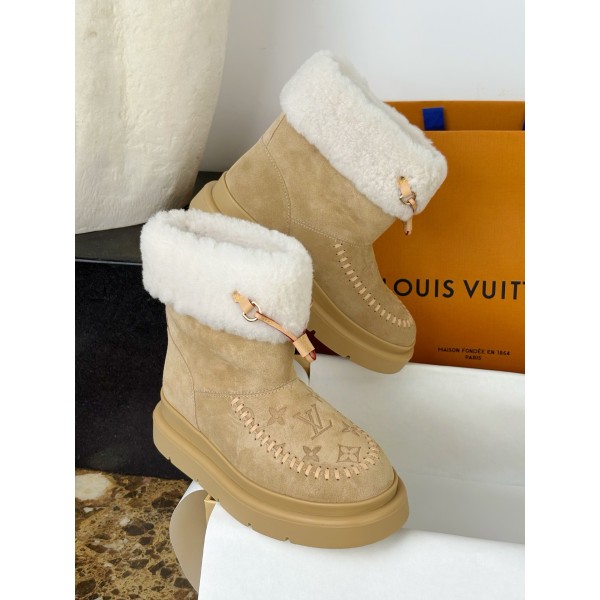 LV 스키 시리즈 스노우 부츠 스웨이드 아웃솔과 양털 안감이 잘 어우러져 있고 모노그램 패턴과 LV 엠보싱 이니셜 디테일이 날렵하며 스티치 짜임의 짜임이 몸체의 넉넉함을 더해줄 뿐만 아니라 세련됨 뒷굽 통굽 디자인으로 키높이 효과는 물론 바닥의 엠보싱 고무가 미끄럼 방지와 내마모성을 제공함