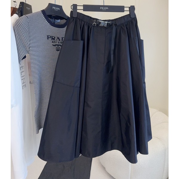 프라다 2026 봄여름 신상 밴딩 벨트 나일론 우산 자락 스커트 클래식한 스위트 핏으로 스타일리시한 스타일링 맞춤형 경량 나일론 소재, 무광 질감 자체 절제되고 고급스러운 느낌 섬세한 터치감은 여전히 부드러우면서도 처진 질감을 유지 하이웨이스트 우산 자락 A라인 스커트 늘씬한 비율, 앞지퍼 여밈은 입고 벗기 편리함 허리는 벨트로 조일 수 있음, 로고 레터링 메탈 액세서리