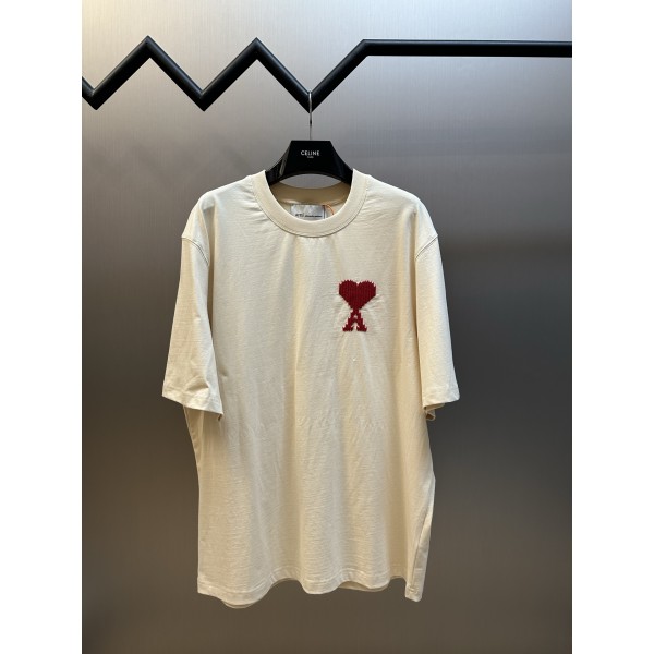 아미 하트 자수 반팔티 맞춤형 안개 및 부드러운 평직 면 원단으로 하트 로고가 거친 픽셀 입자로 분해되어 픽셀 해결 구조로 가슴에 포인트를 주었으며 뒷부분의 AMI 레터링 자수와 어우러져 브랜드 인지도를 높임 수입 기계 자수 기술을 채택하고 첨단 컴퓨터 제어 시스템과 정밀한 기계 부품을 사용하여 픽셀화된 사랑의 A 자수 및 Ami 문자 자수 작업을 실현함