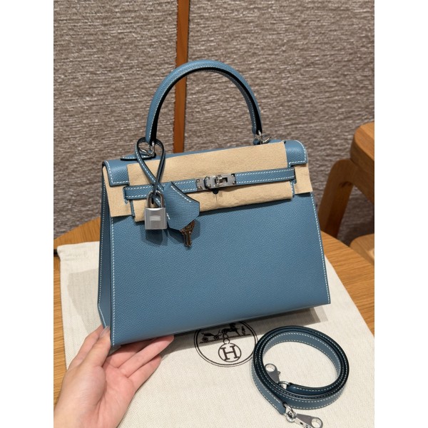 Style:Kelly Colour:75/Blue Jean Size:25*17*7cm Leather:Epsom From France Hardware:silver 켈리 25cm, 인디고블루, 프랑스 수입 순정 소가죽 장문 은단추, 고급스러운 풀핸드메이드 커스텀 핸드메이드 못, 핸드메이드 철물, 정강 도금 18k 철물 주문 실사